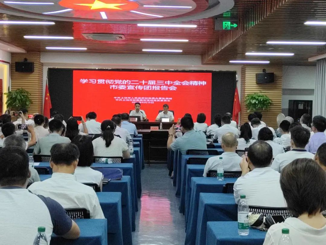 9月10日上午,由中共上饶市人民政府驻南昌办事处党组、中共上饶市驻南昌市流动党员委员会联合举办的学习贯彻党的二十届三中全会精神宣讲报告会在南昌鄱商大厦举行。市委宣讲团成员、市委宣传部副部长吴晓俊作宣讲报告。办事处党组书记、主任,流动党委书记王坤南主持并讲话,在昌饶籍商会会长、流动党支部书记及其他代表同志共110余人聆听报告。我会党委书记饶英奇,执行会长、第二支部书记刘涛,党委副书记徐礼成,副会长、第一支部书记王朝有,副会长、第二支部副书记毛少华,副会长李璇,执行秘书长张承凤,理事兼常务副秘书长吴明珠,会员许武庆、黄建荣、刘江雲共计11人参加学习。