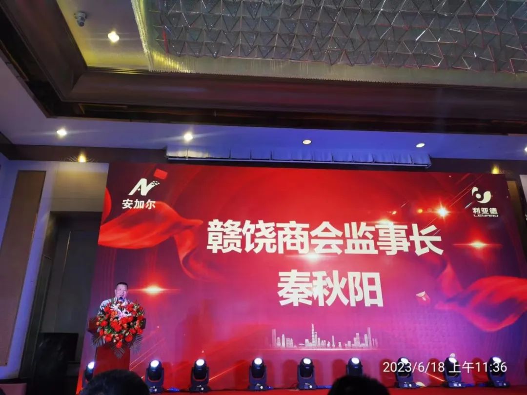 秦秋阳监事长受会长饶明芳委托代表我会上台致辞,祝愿江西安加尔科技有限公司在程玄东理事的带领下再创辉煌事业,拥有更加灿烂的明天!