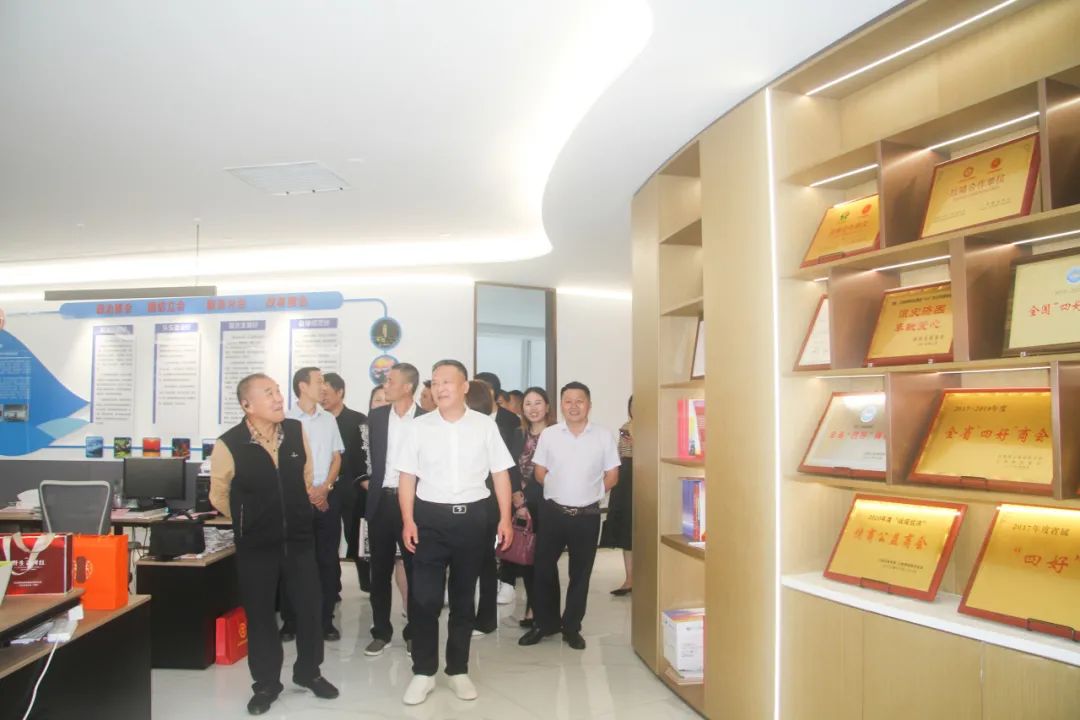 饶明芳会长陪同大家参观了商会的领导关怀、会长风采墙、荣誉墙、党建文化长廊和会员之家等。