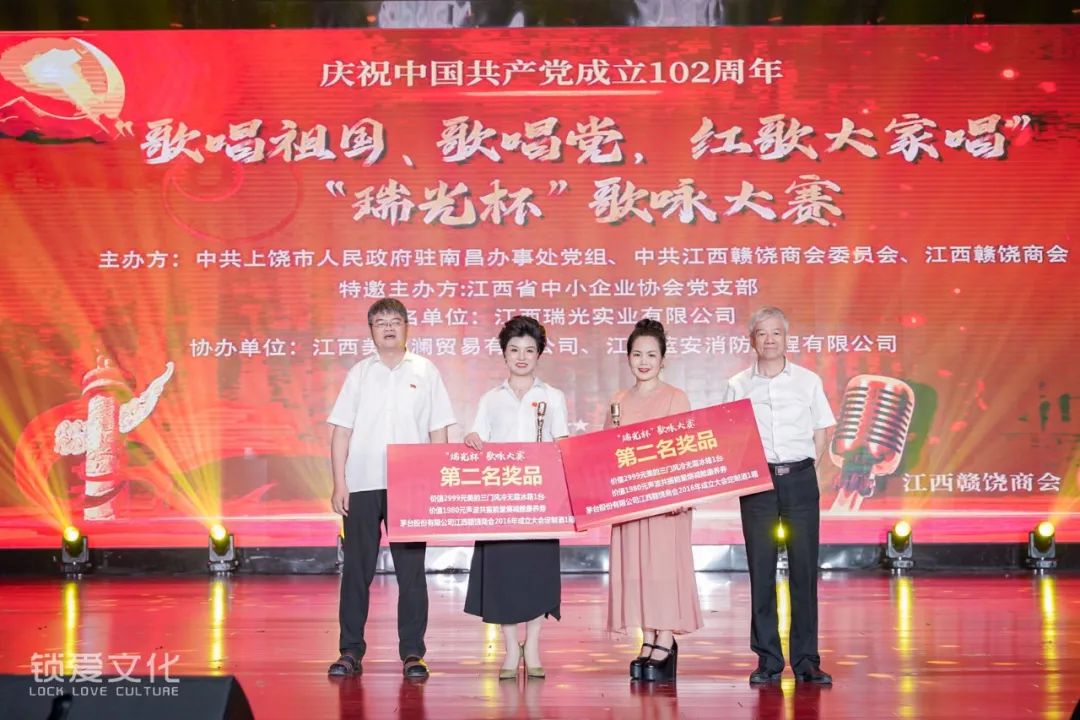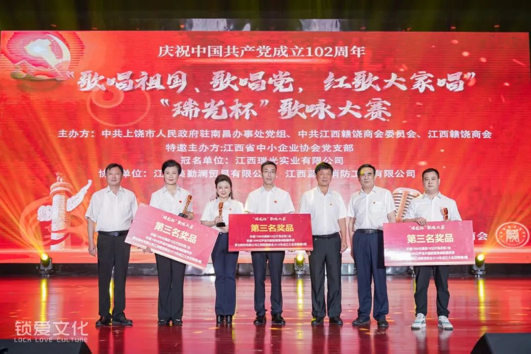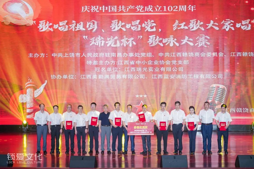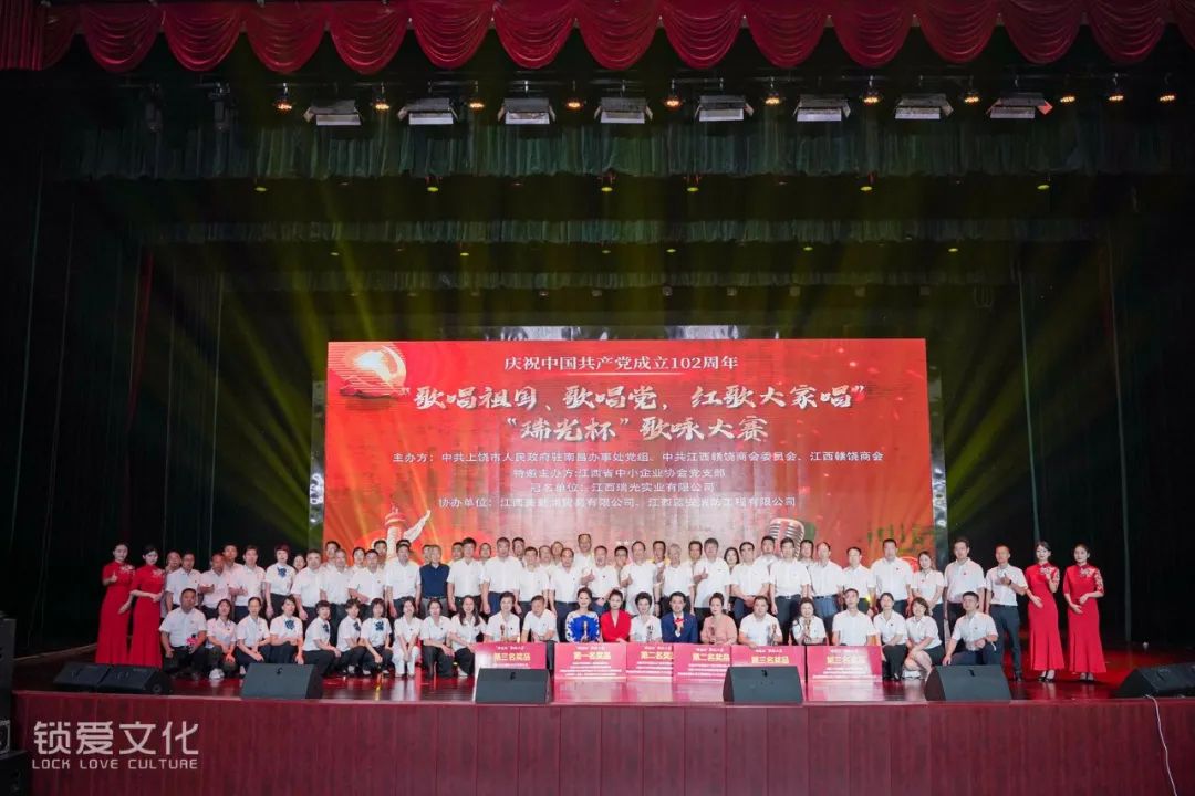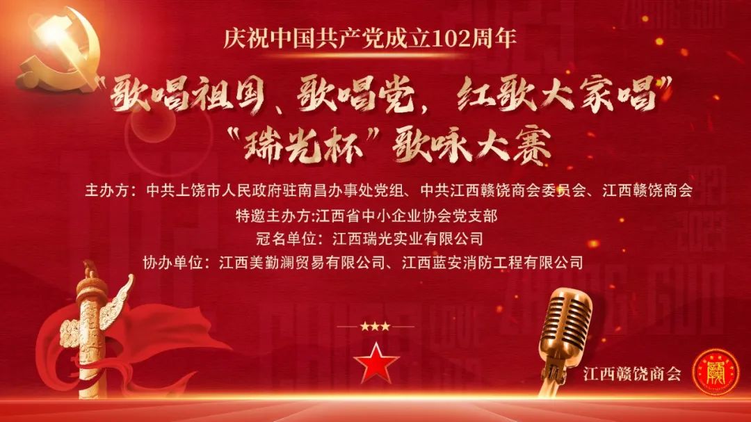 为庆祝中国共产党成立102周年,深情回顾党的百年奋斗历程,热情讴歌党的光辉伟绩、讴歌伟大祖国,2023年7月1日下午,由中共上饶市人民政府驻南昌办事处党组、中共江西赣饶商会委员会、江西赣饶商会联合主办的“歌唱祖国、歌唱党,红歌大家唱”“瑞光杯”歌咏大赛在江西旅游商贸职业学院文体中心隆重举行。