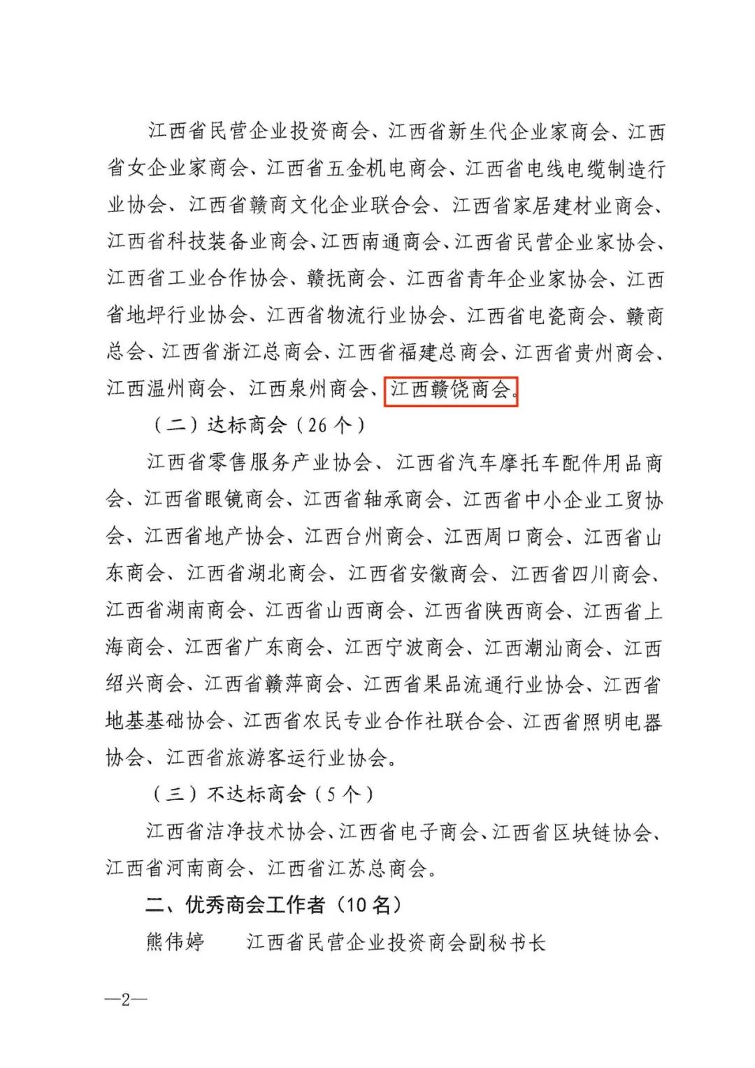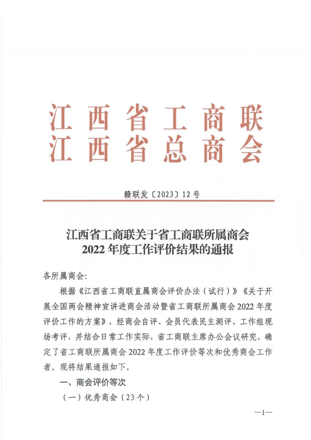 江西省工商业联合会于2023年7月6日印发了《江西省工商联关于省工商联所属商会2022年度工作评价结果的通报》(赣联发〔2023〕12 号),江西赣饶商会被评为2022年度全省“优秀商会”。