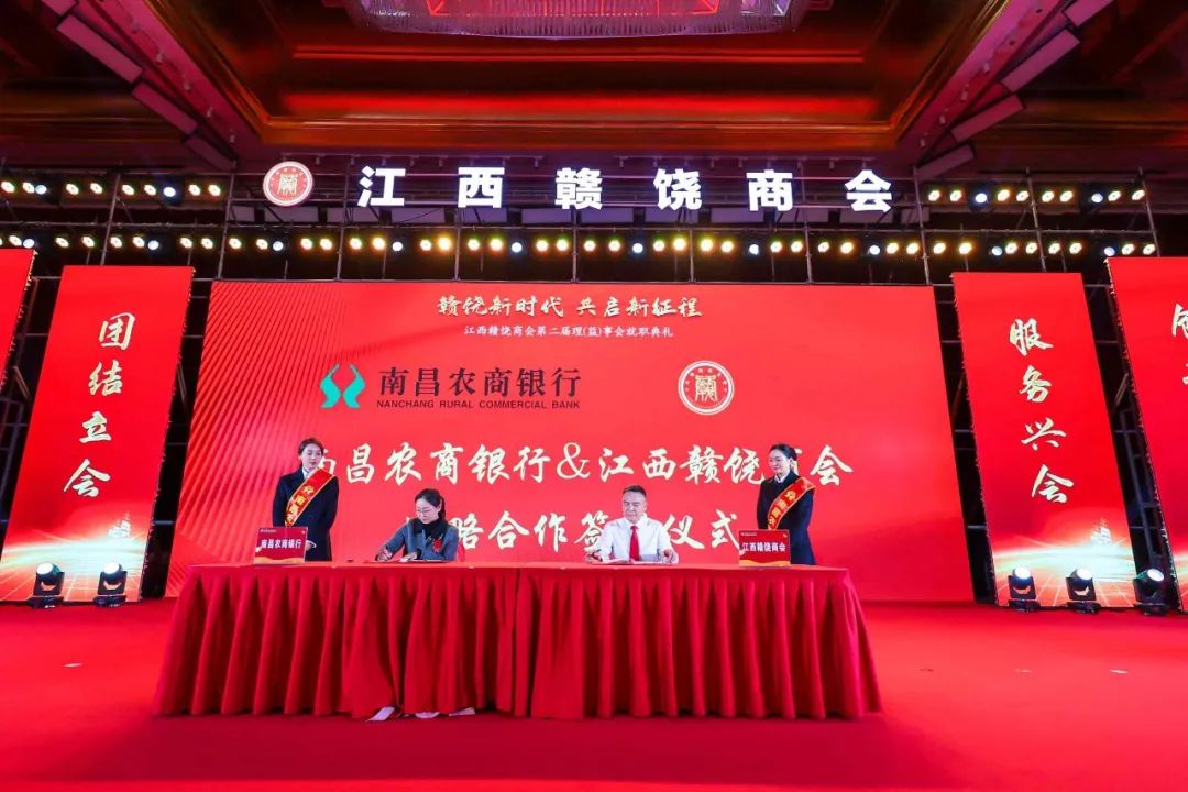南昌农商银行党委委员、副行长晋丽玲与江西赣饶商会会长饶明芳作为双方签约代表进行现场战略合作签约