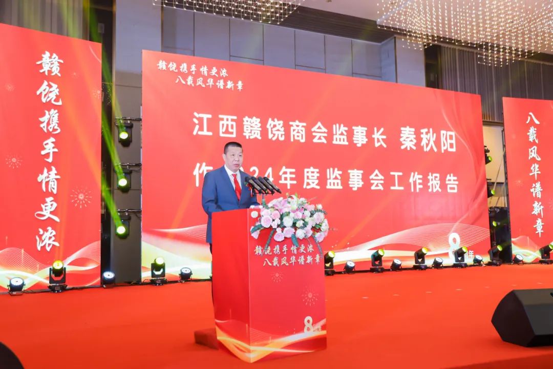 秦秋阳监事长代表监事会作2024年度监事会工作报告,报告一是介绍了2024年度监事会基本工作情况,二是对2024年度江西赣饶商会理事会工作进行了评价,三是对2024年度商会财务情况进行了通报。他表示监事会将继续履行好职责,对商会的重大事项、重要活动和财务收支等进行监督和检查,保障会员的合法权益和商会各项工作的正常开展。