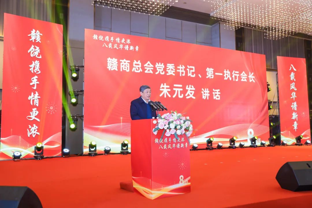 朱元发书记代表赣商总会向商会成立八周年表示祝贺。他对商会成立以来的各项工作表示肯定,并提出三点期望:一是不忘立会初心,进一步加强商会建设,积极为会员提供更加专业、更加贴心的服务;二是进一步加强与赣商总会、饶商联合总会、全球江西商会的交流合作,弘扬“厚德实干、义利天下”的赣商精神,发扬“勤劳、智慧、大气、包容”的饶商品格;三是一如既往服务好广大会员的同时,充分发挥商会资源优势,积极宣传江西良好的发展态势和优质的营商环境,成为江西的“宣传员”,为江西的经济社会发展注入新的活力。