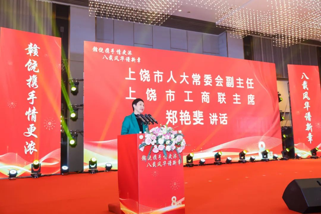 郑艳斐主席代表中共上饶市委、上饶市人民政府向商会成立八周年表示祝贺,对商会八年以来始终坚持“凝聚乡情、服务饶商、抱团发展、回报社会”的宗旨,务实开拓、不断发展壮大,情系家乡、积极回馈桑梓给予肯定。她介绍了上饶的旅游资源、产业发展和交通出行优势。她希望商会更好地发挥联结纽带和资源整合的作用,积极帮助会员企业把握机遇、应对挑战,不断做大做强,为促进当地经济社会发展,深化昌饶两地交流合作做出更大贡献。同时希望商会为家乡引资引智牵线搭桥,为上饶的经济、文化、社会发展和乡村振兴献计出力。