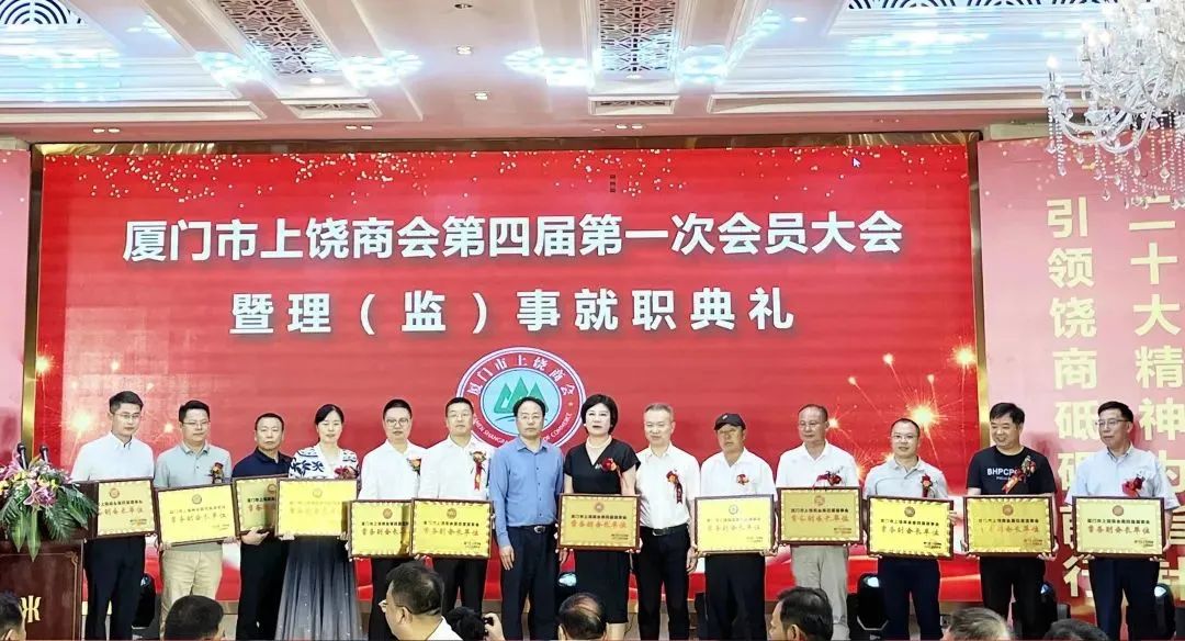 就职典礼上,与会领导及嘉宾为厦门市上饶商会领导班子及会员授牌。