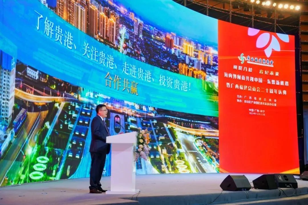 自治区副主席廖品琥在致辞时表示,自治区党委、政府高度重视闽商在桂发展,高度关注闽商以广西为桥头堡“出海”东盟的战略部署。广西经济社会发展与闽商在桂扎根创业成长密不可分,60多万在桂闽商为推动广西经济高质量发展作出了积极贡献。他指出广西正处于重大战略机遇交汇期、重大支持政策叠加的黄金发展期,特别是广西持续推进以沿边临港产业园区为统领的各类园区建设,中央在财税、财政、用地、用工、通关等方面出台一系列支持政策,为广大企业投资兴业、大显身手提供了广阔空间。诚挚欢迎大家以此次广西之行为契机深入各地考察交流、深化产业对接、寻求共赢发展。广西将持续打造“营商广西·桂在便利”品牌,用好中央赋予广西的重大支持政策,完善投资便利服务体系,及时兑现各项优惠政策,为企业投资发展保驾护航。