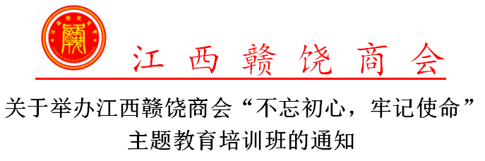 为深入学习习近平总书记的重要讲话精神和党的方针政策,不忘初心,牢记使命,推动党的重大决策部署在民营经济领域的贯彻落实,巩固和扩大党执政的群众基础,弘扬方志敏同志的政治本色和革命气节,引导会员听党话、跟党走。经研究,定于2019年12月1日-2日在弋阳方志敏干部学院举办江西赣饶商会“不忘初心,牢记使命”主题教育培训班。具体事项通知如下: