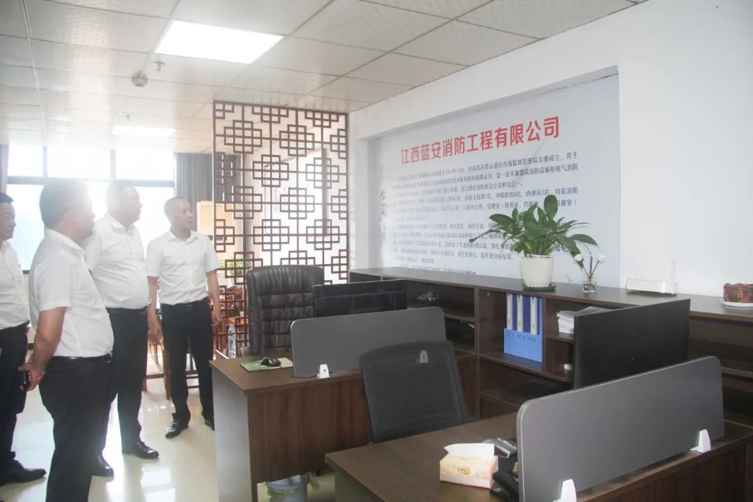 2024年4月23日,为摸底商会会员企业发展状态,加强会员企业对消防安全的重视和防范意识,应企业邀请,轮值会长汪强辉组织走访副会长毛少华单位——江西蓝安消防工程有限公司及会员李贵福单位——江西蓝盾保安服务有限公司。轮值会长汪强辉,执行会长、第二支部书记刘涛,执行会长聂丁科、陈红怀、周水强、程顺林,常务副会长张祖泉,轮值副会长董阳东,副会长、第二党支部副书记毛少华,副会长王世前、潘求林、喻腰华、程玲琴,执行秘书长张承凤,理事兼副秘书长吴虹云、毛小宝一行共30余人参加活动。