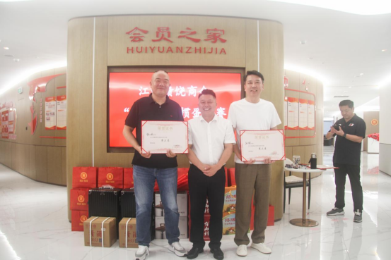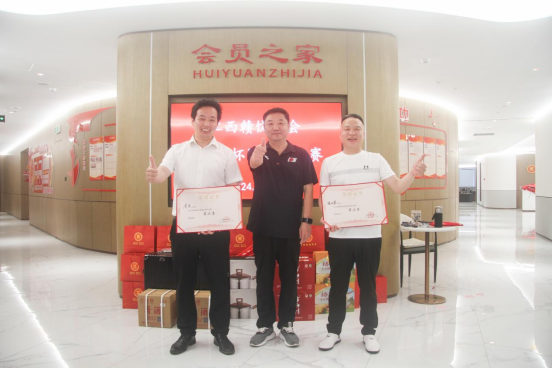 饶明芳会长为一等奖获得者余飞会员和曾勇刚乡友颁奖。