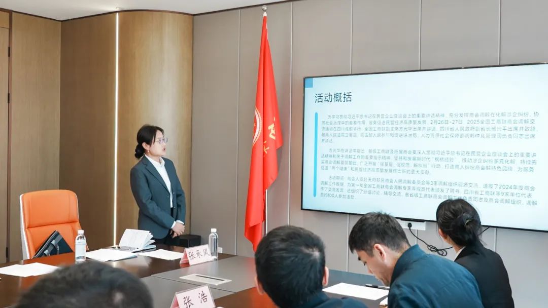 会上,执行秘书长张承凤就参加2025全国工商联商会调解交流活动作了学习心得分享,她讲到,一是调解工作的现状与增长。2024年商会调解组织自主收案,主动化解案件数量超过22000多件,较2023年相比,增长了122%;二是商会调解工作的重要性。为推进法治建设,需进一步加强调解员队伍建设,同时加强法律法规宣传;三是提升商会调解工作效能。比如提供必要的办公场所、设施和经费保障,大力培育和宣传典型成功经验,以实现实质性化解纠纷的目标。