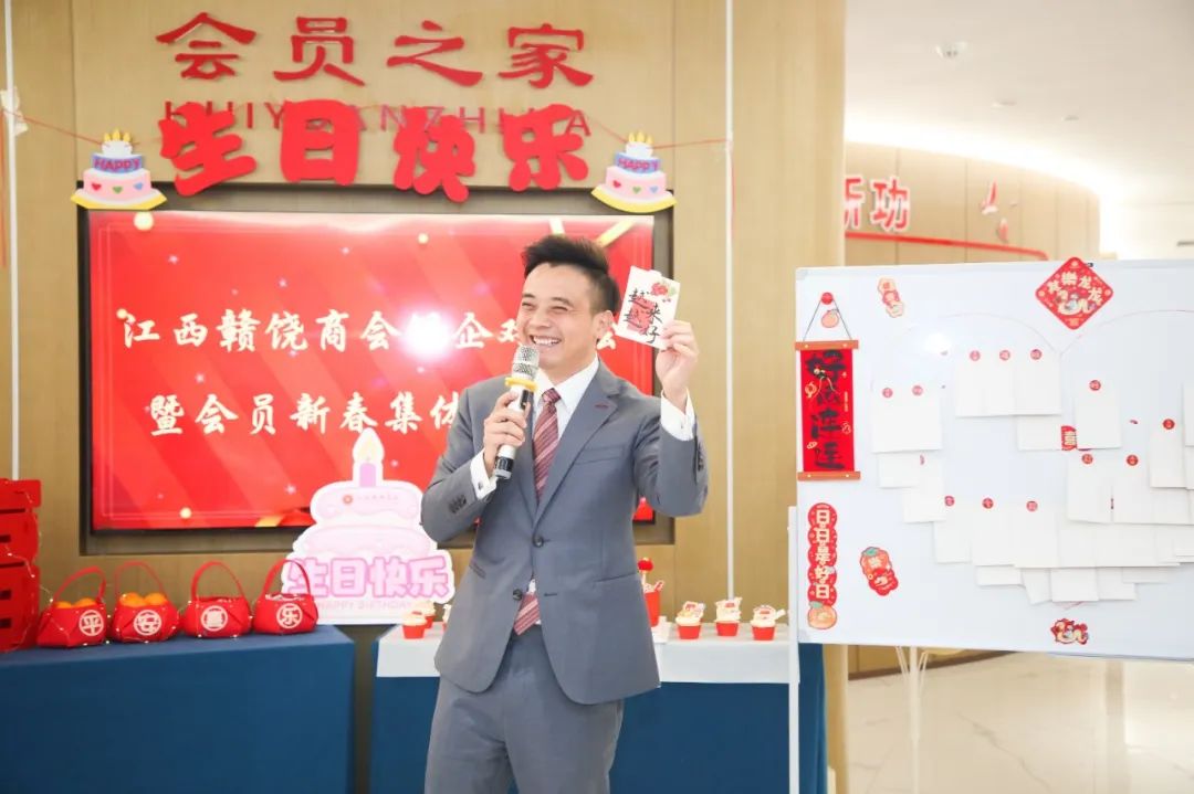 随后执行秘书长张承凤代表秘书处上台表达了新春问候,送上生日祝福,本次生日会,秘书处为大家精心准备了满满的祝福墙,希望新的一年给大家带来好彩头。同时她给大家再次讲解了商会优秀会员评选方法和待遇,鼓励大家在2024年:人人争做优秀会员,努力打造一流赣饶。她还传达了会费缴纳的好消息:3月19日起商会开始收取第二届老会员第二年的会费,为减轻大家的负担,保持赣饶强大、团结的队伍,经班子领导研究决定:会费缴纳在原有的一届五年,一次性缴纳三年减免两年的政策上做延伸,即在3月19 日前完成三年会费缴纳的,仍可减免两年。最后承凤秘书长表示,新的一年,商会秘书处将继续努力,不断超越,全力做好会员服务工作;从商会内外部,多样化开展对接工作,为商会企业发展添砖助力!